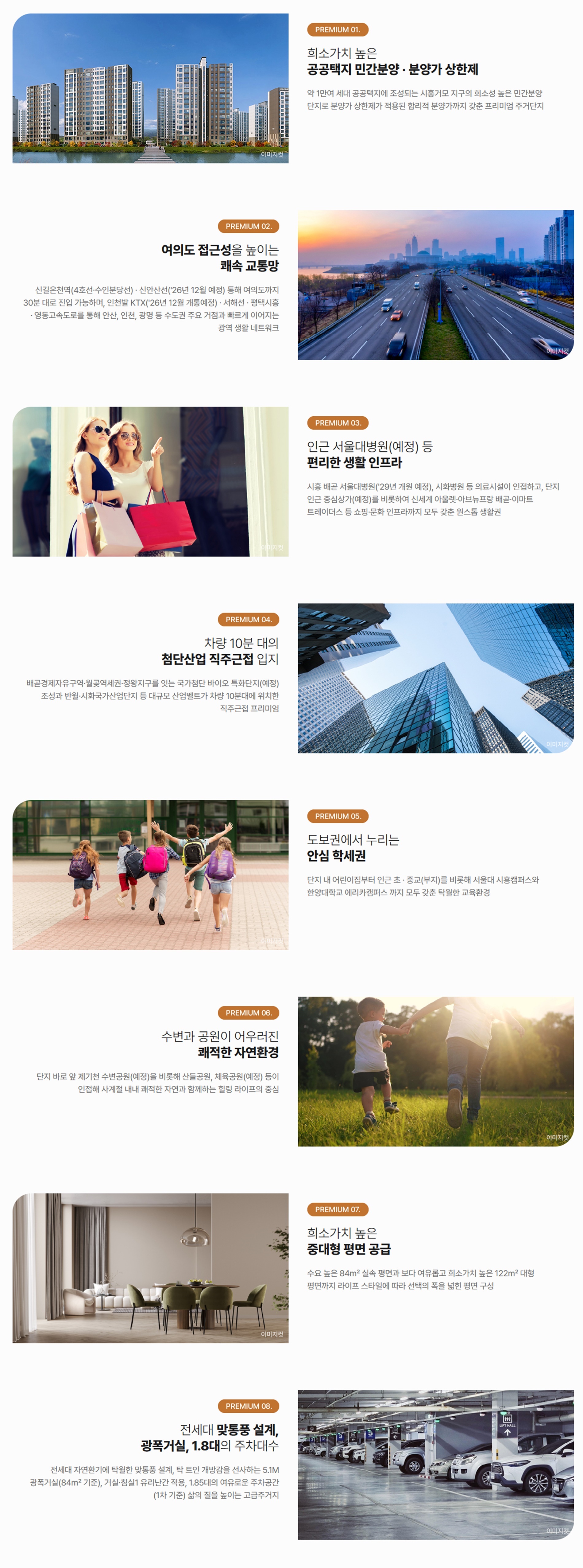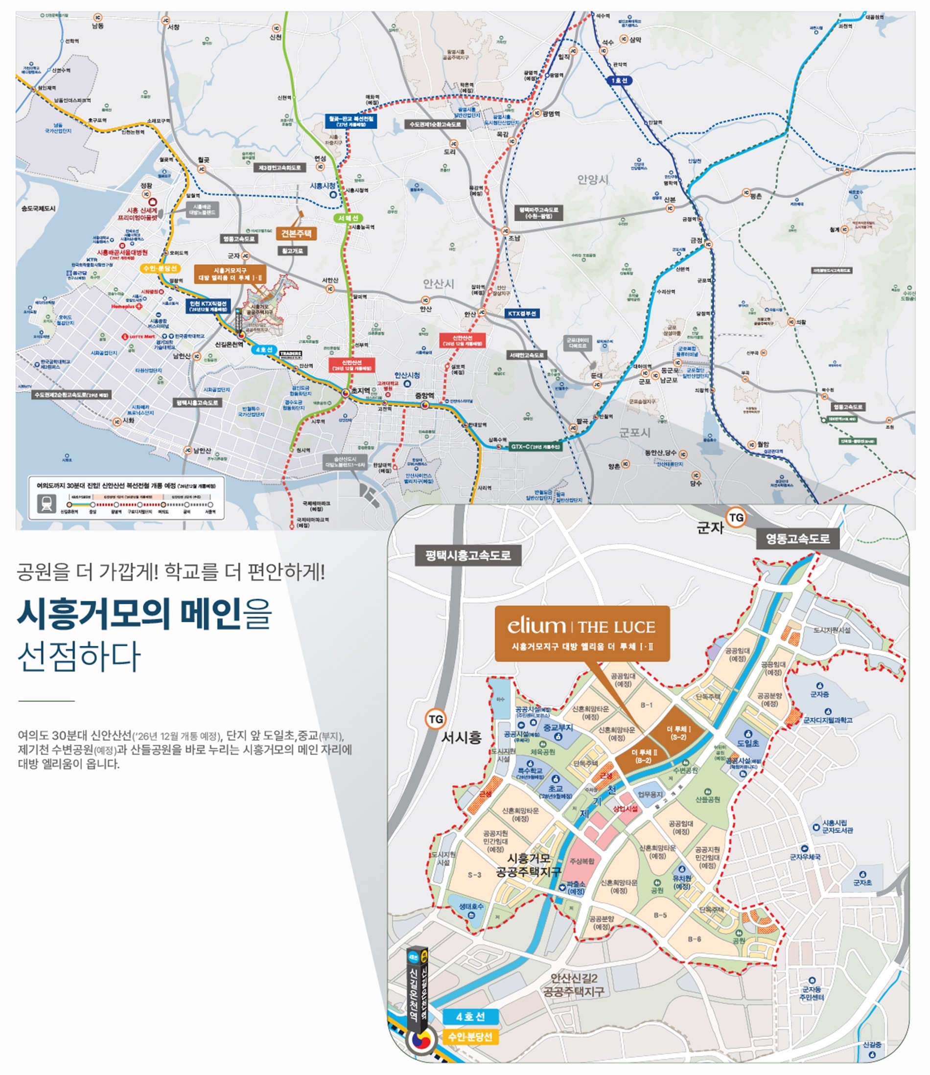 대방건설이 선보이는 고품격 주거 브랜드 엘리움만의 차별화된 가치와 프리미엄 라이프의 시작 대방건설의 고품격 주거 철학이 담긴 브랜드 프리미엄을 통해 자부심을 높이는 특별한 단지를 경험할 수 있습니다. 광폭 거실 설계로 누리는 개방감 기존 평면의 한계를 넘어선 혁신적인 실내 공간 구성 대방만의 특화된 광폭 거실 설계를 적용하여 가족 모두가 여유롭게 생활할 수 있는 쾌적한 주거 환경을 제공합니다. 최첨단 스마트 시스템의 편리함 입주민의 안전과 편의를 생각한 홈 네트워크 서비스 에너지 절감부터 보안까지 원격으로 제어하는 최첨단 스마트 홈 시스템을 도입하여 스마트한 일상을 선사합니다. 품격 있는 커뮤니티와 테마 조경 운동과 휴식을 동시에 즐길 수 있는 원스톱 힐링 단지 피트니스, 실내 골프연습장 등 입주민 전용 시설과 단지 내 산책로 및 수경 공간이 어우러진 숲세권 단지를 완성했습니다. 우수한 교육 환경과 풍부한 인프라 자녀를 위한 안심 통학권과 편리한 생활 편의시설 인근에 위치한 교육 시설로 안심 교육 여건을 갖췄으며 주변 상업지구와 인접하여 생활의 모든 편의를 가깝게 누립니다. 쾌속 교통망으로 누리는 중심 생활 주요 도심을 빠르게 연결하는 최적의 교통 네트워크 주요 간선도로 및 광역 교통망 접근성이 뛰어나 인접 지역으로의 이동이 자유로운 교통의 중심지에 위치합니다.